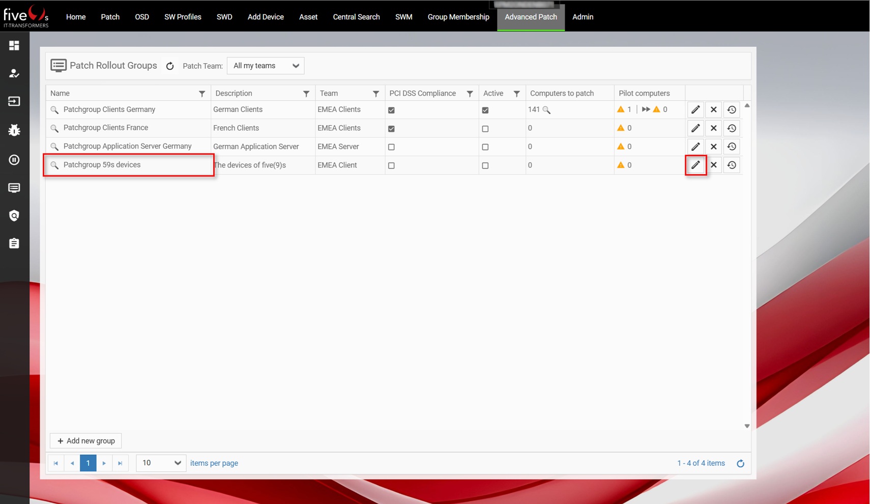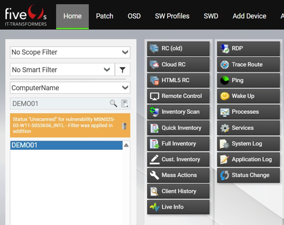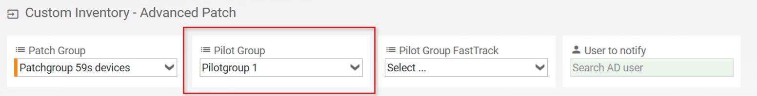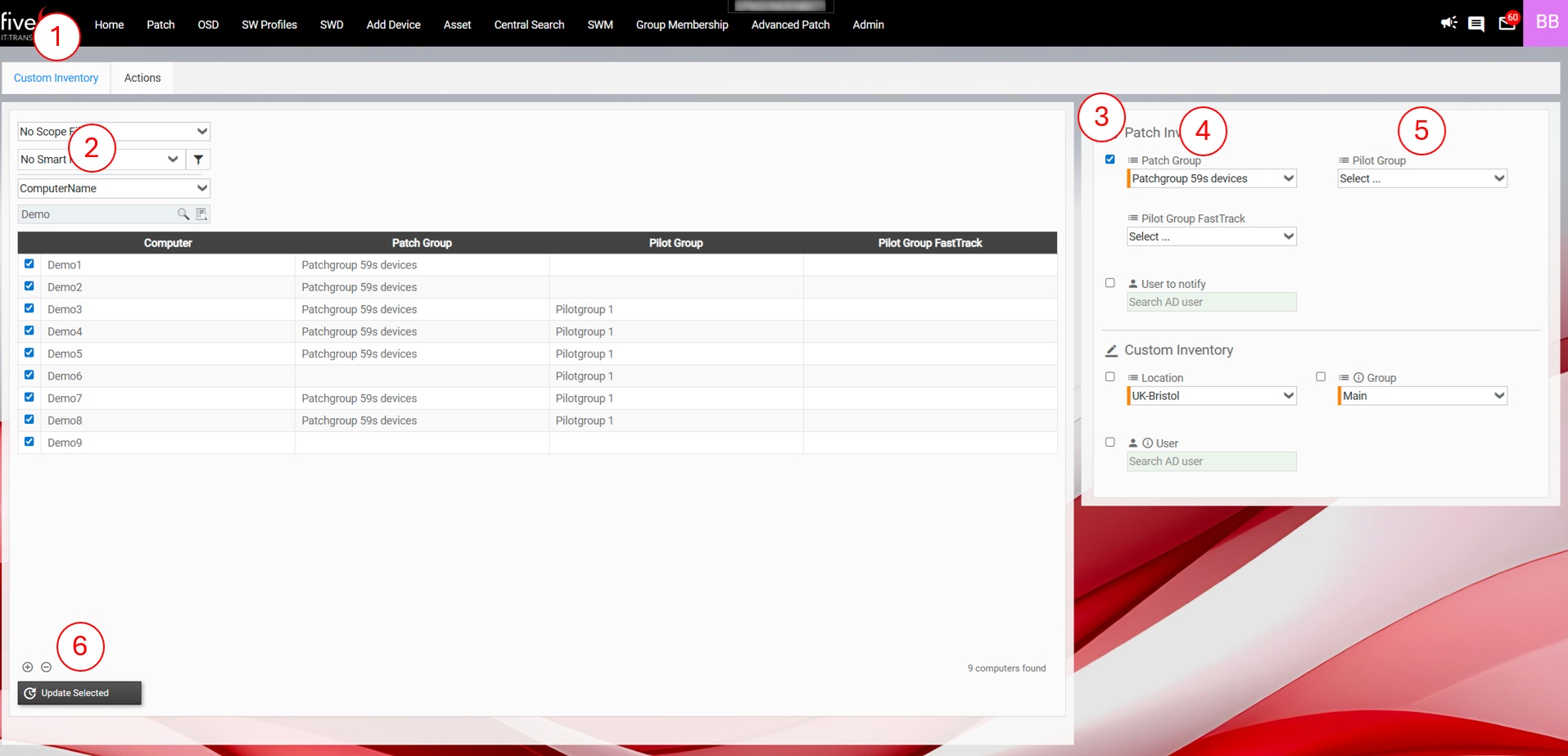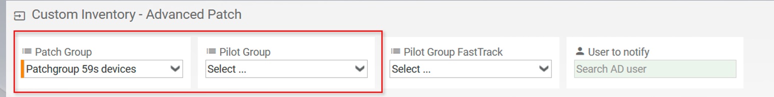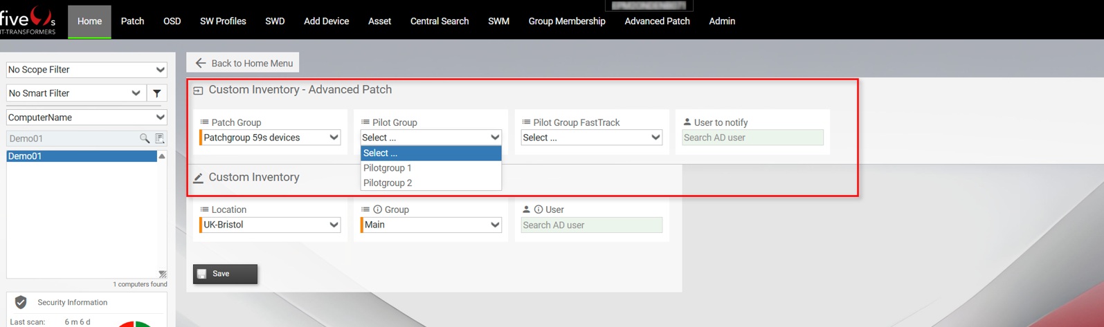 Devices can be assigned to a Patch Rollout Group using the Custom Inventory of the five(9)s Console. When you activate Advanced Patch with a license, patch-related CI objects are automatically added to the Custom Inventory. Go to the Home screen, select a device, and click on Custom Inventory. Then pick a Patch Group, and optionally a Pilot Group and a User to notify.