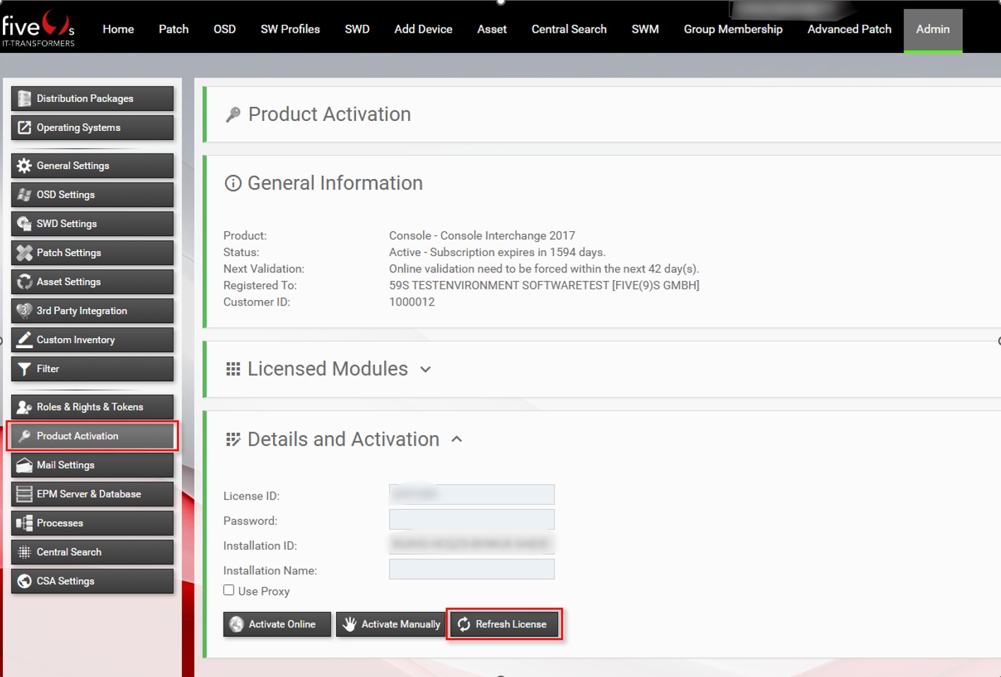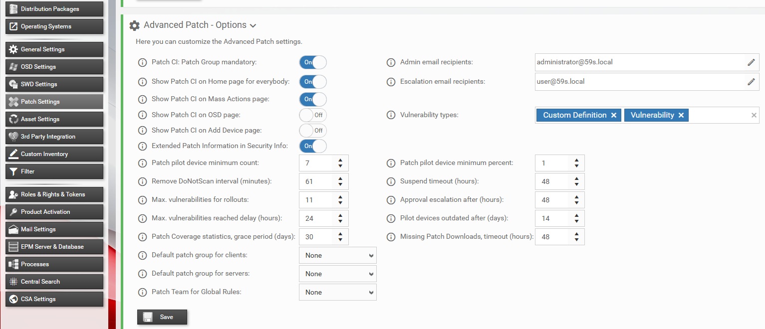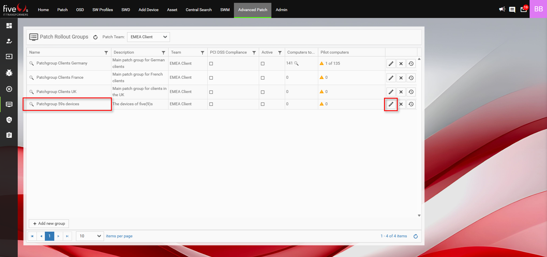 Devices can be assigned to a Patch Rollout Group using the Custom Inventory of the five(9)s Console. When you activate Advanced Patch with a license, patch-related CI objects are automatically added to the Custom Inventory. Go to the Home screen, select a device, and click on Custom Inventory. Then pick a Patch Group, and optionally a Pilot Group and a User to notify.