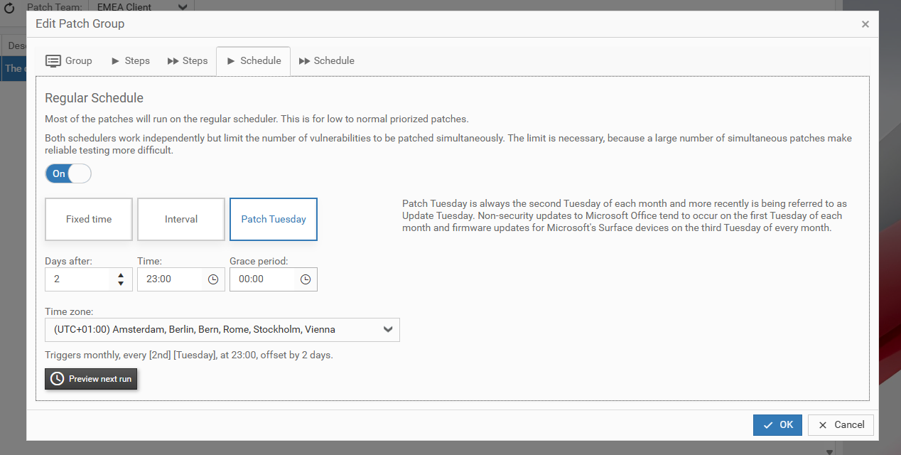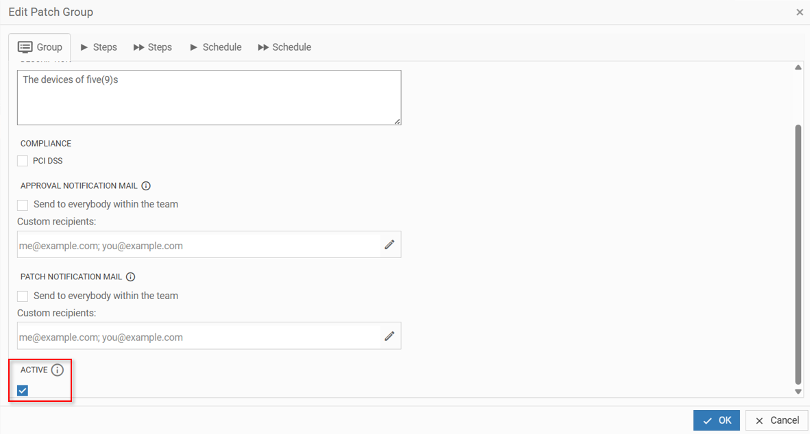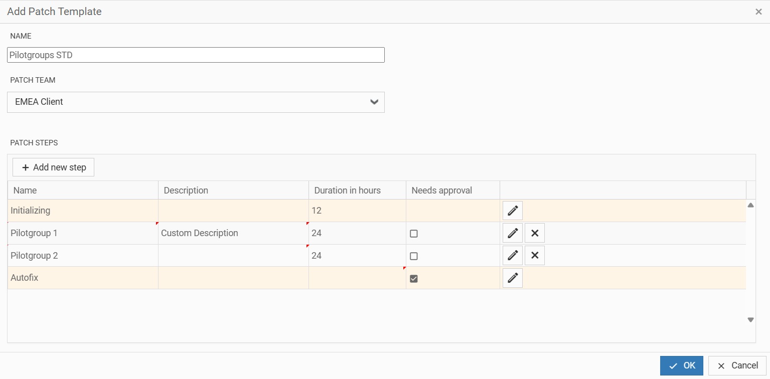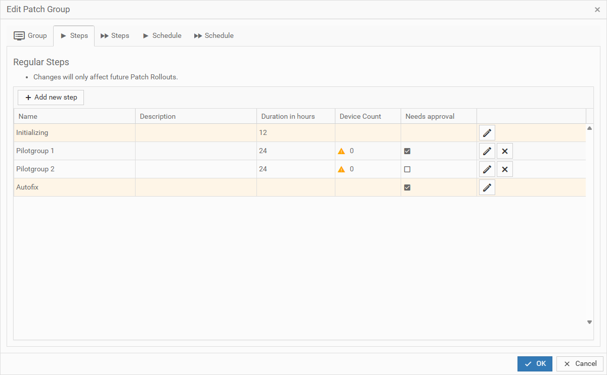 The values depend on the settings you made earlier. The following screenshots show the Edit Patch Group dialog we completed earlier. It displays the Patch Rollout Group Patchgroup 59s and its included steps:
