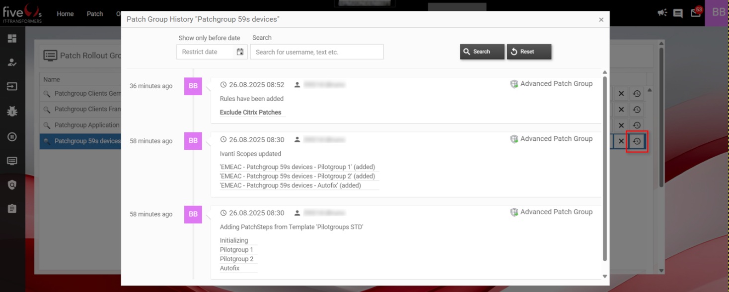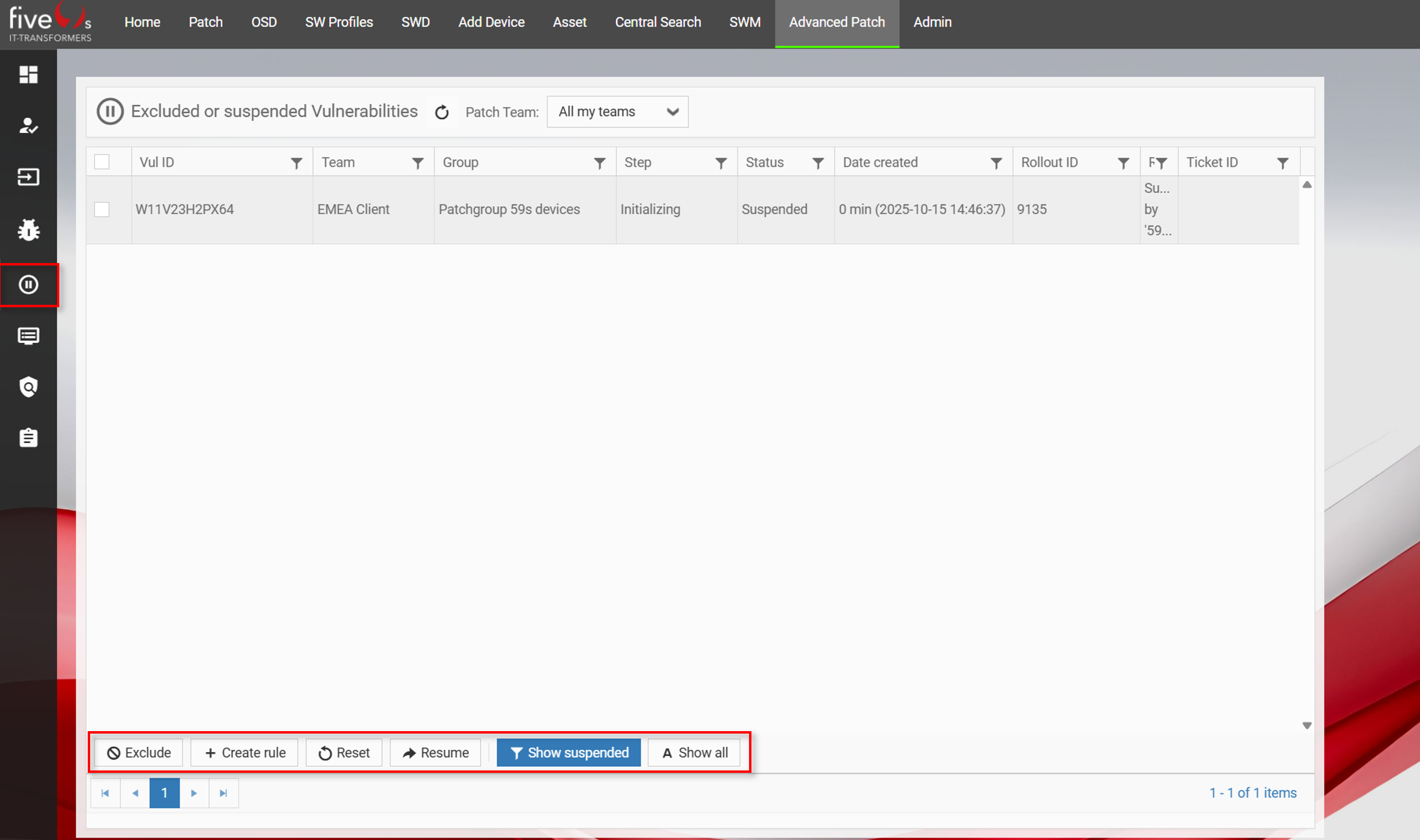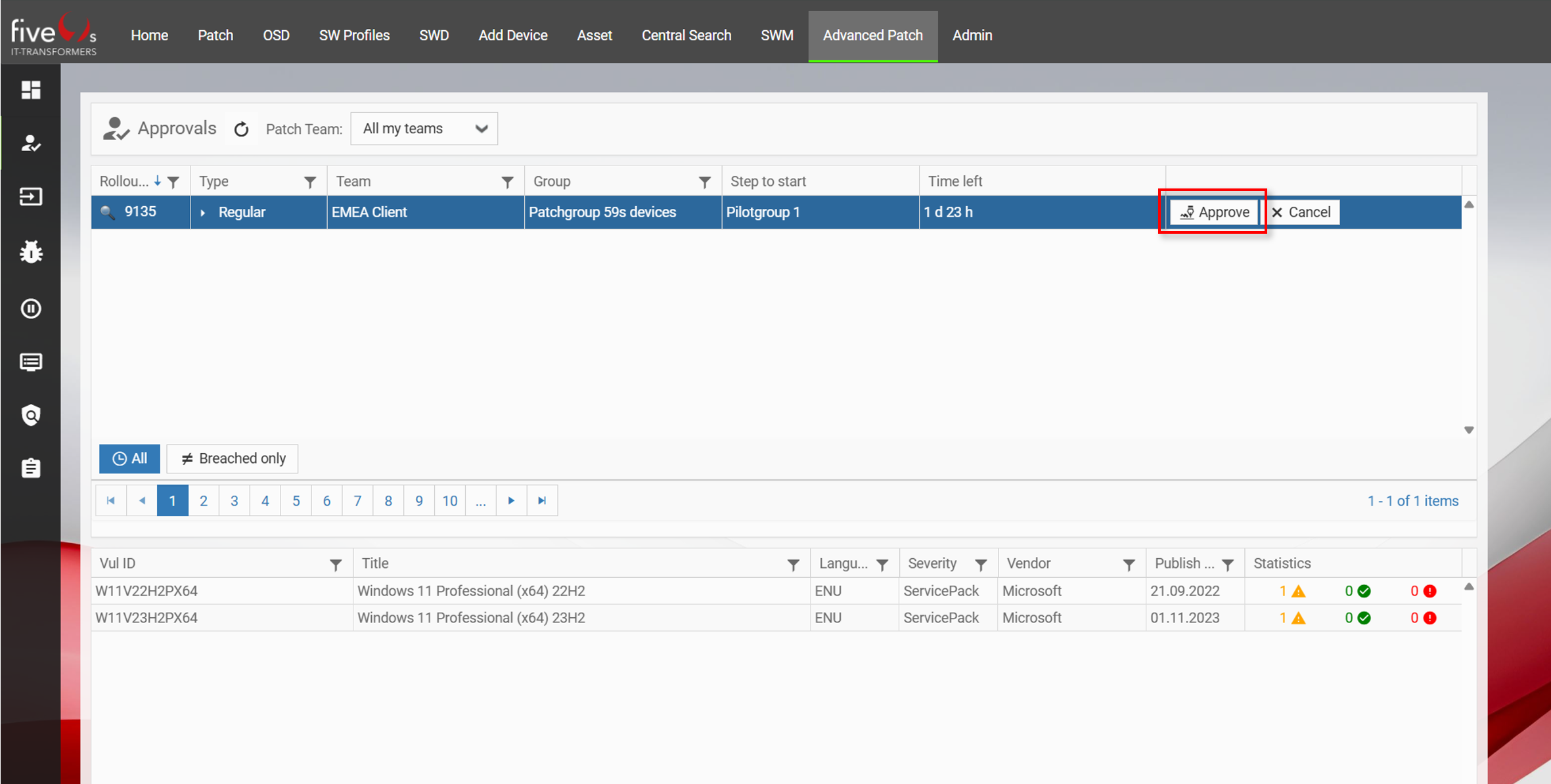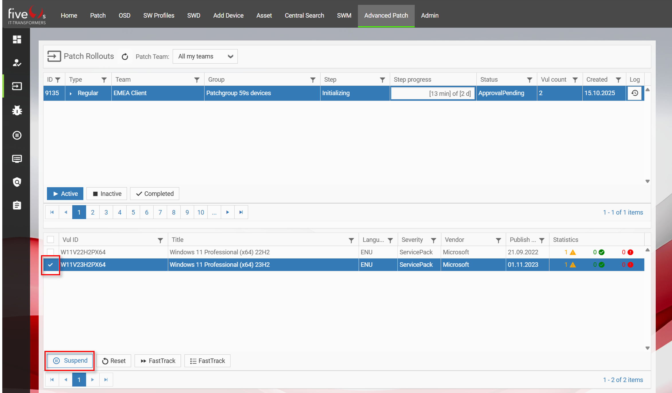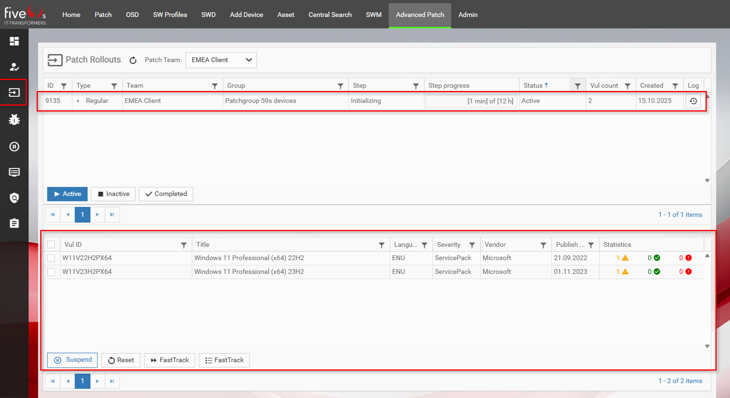 Info: As you can see, the Patch Rollout for group Patchgroup 59s devices is in step Initializing and has a vulnerability count of 2.