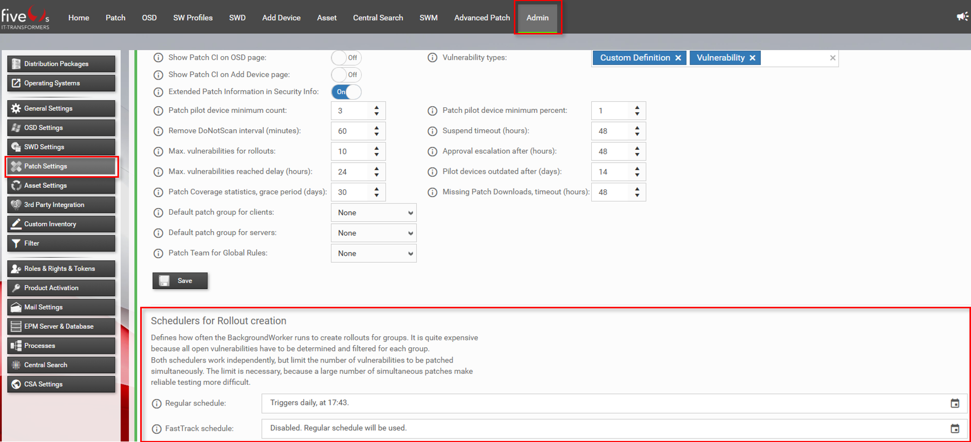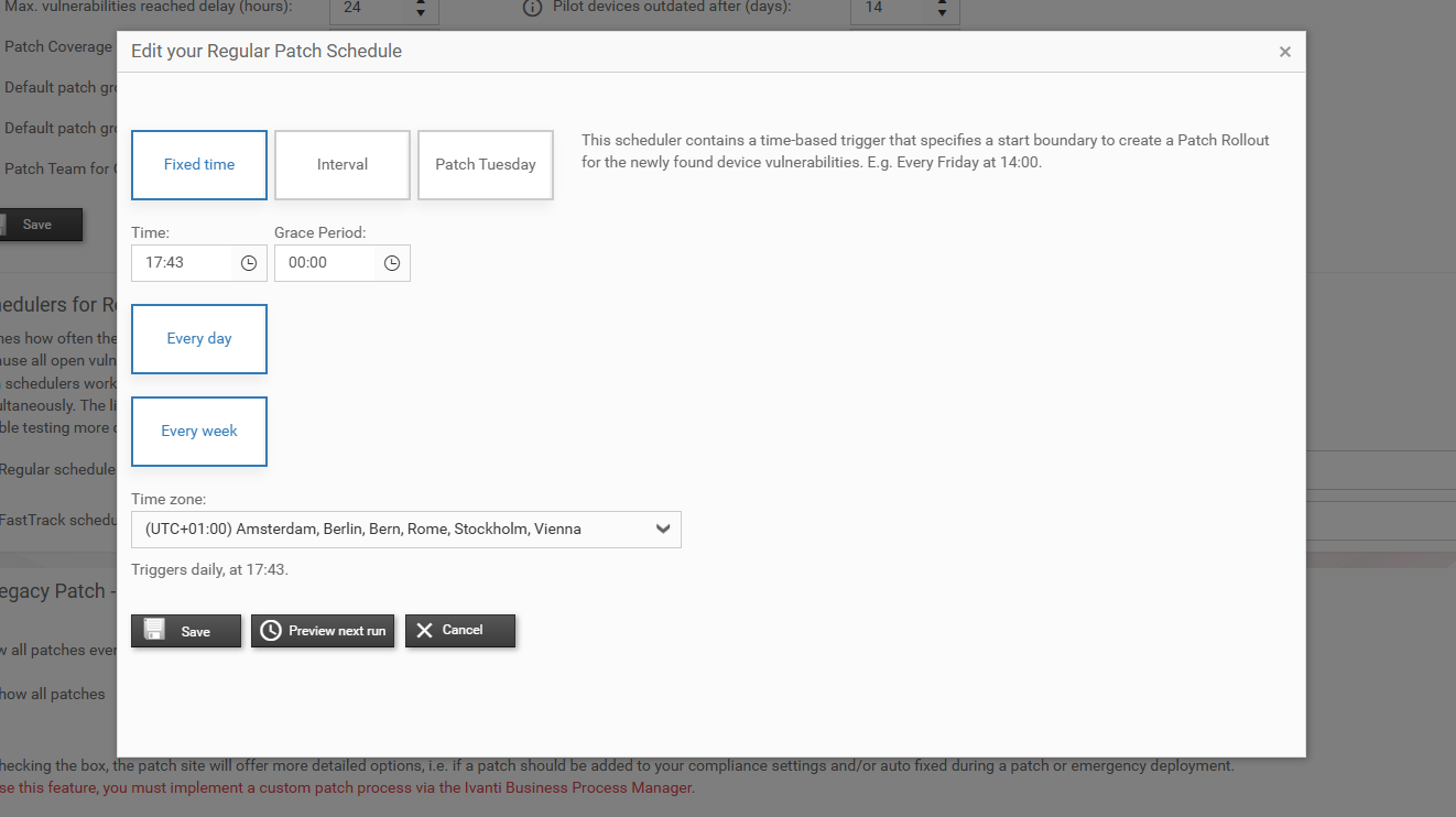 In the schedule tabs (Regular and Fast Track), you can configure individual schedulers that control when the background worker creates Rollouts. By default, the settings from the Admin page are applied (see previous section).