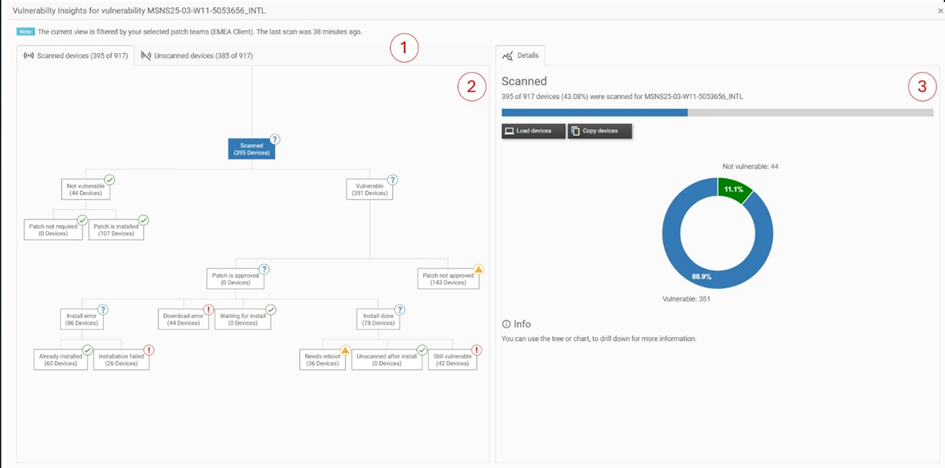 At the top left (1) of the Vulnerability Insights view, you will find two tabs for all devices, divided into Scanned and Unscanned. The active Scanned tab (2) shows the statuses of all devices that have already been scanned for the selected vulnerability, while the Unscanned tab shows devices that have not yet been scanned. On the right (3), the Details section displays information relevant to the currently selected node in the tree on the left.