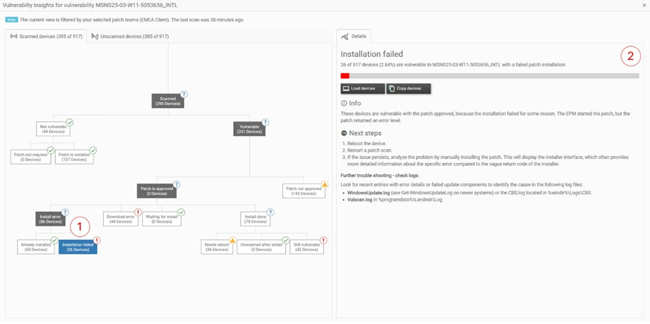 The selected node is highlighted on the left (1) and the Details section on the right shows detailed information (2) . This details section provides Info and Next Steps relevant to the selected node. You can use the information to resolve potential issues. If you want to analyze the devices further you can press on Copy devices to copy their names or on Load devices to move to the home screen and filter for them n the home screen and further analyze them.